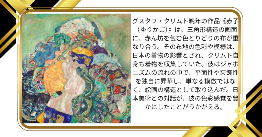 クリムトは、尾形光琳の『紅白梅図屏風』や『燕子花図屏風』に強く惹かれたといわれ、