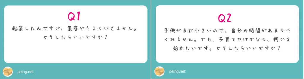 こちらの企画では、peingの質問箱を使ってオールジャンルに何でもご質問いただけます。ご質問の内容に適任の運営メンバーやAile Academy講師達が、エールの日(8日・18日・28日)の20時に、オンラインサロンやTwitter、ブログなどオープンな場で回答しています。