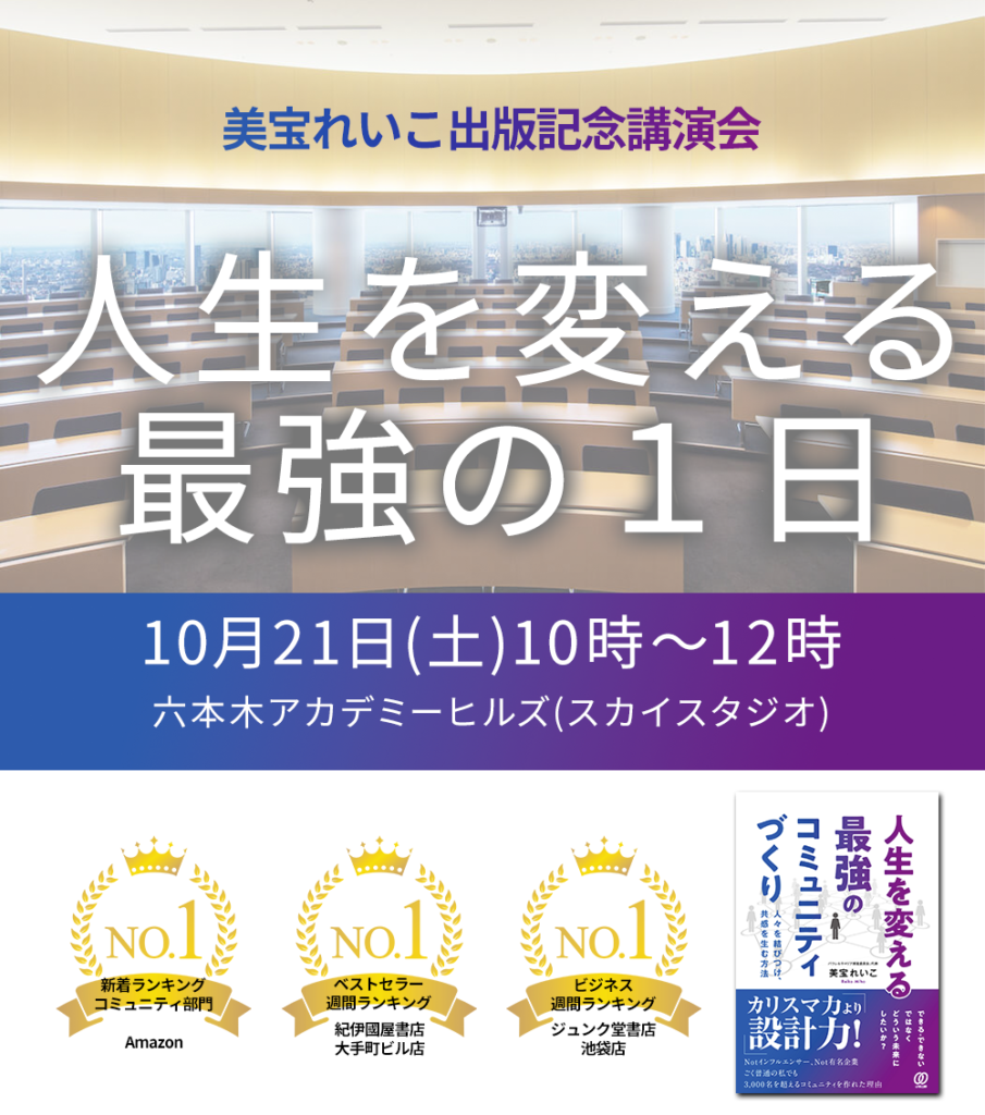 8/7に発売された「人生を変える最強のコミュニティづくり」が、おかげさまでAmazon新着ランキングコミュニティ部門1位、紀伊國屋大手町ビル店ベストセラー週間ランキング1位、ジュンク堂書店池袋店ビジネス週間ランキング1位、と3冠を達成することができました。これを記念して、出版講演会を開催いたします。